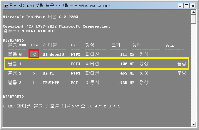 빨간색 박스 윈도우 설치 드이브 명이 맞으면 노란색 박스 ESP 파티션 볼륨 번호를 선택을 합니다.