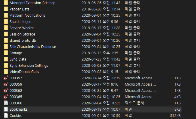 위 폴더에서 Bookmarks파일이 현재 사용하고 있는 북마크 저장파일이다.