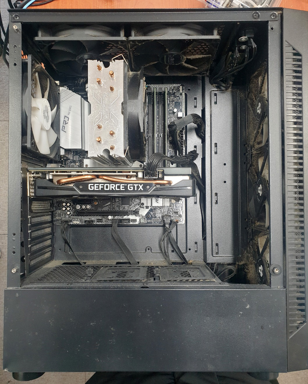 고객님의 PC를 받아본 순간, 가장 먼저 눈에 띈 것은 바로 내부 곳곳에 두껍게 쌓인 먼지 카펫이었습니다. 마치 PC 내부가 숨을 쉬지 못하는 듯했습니다.