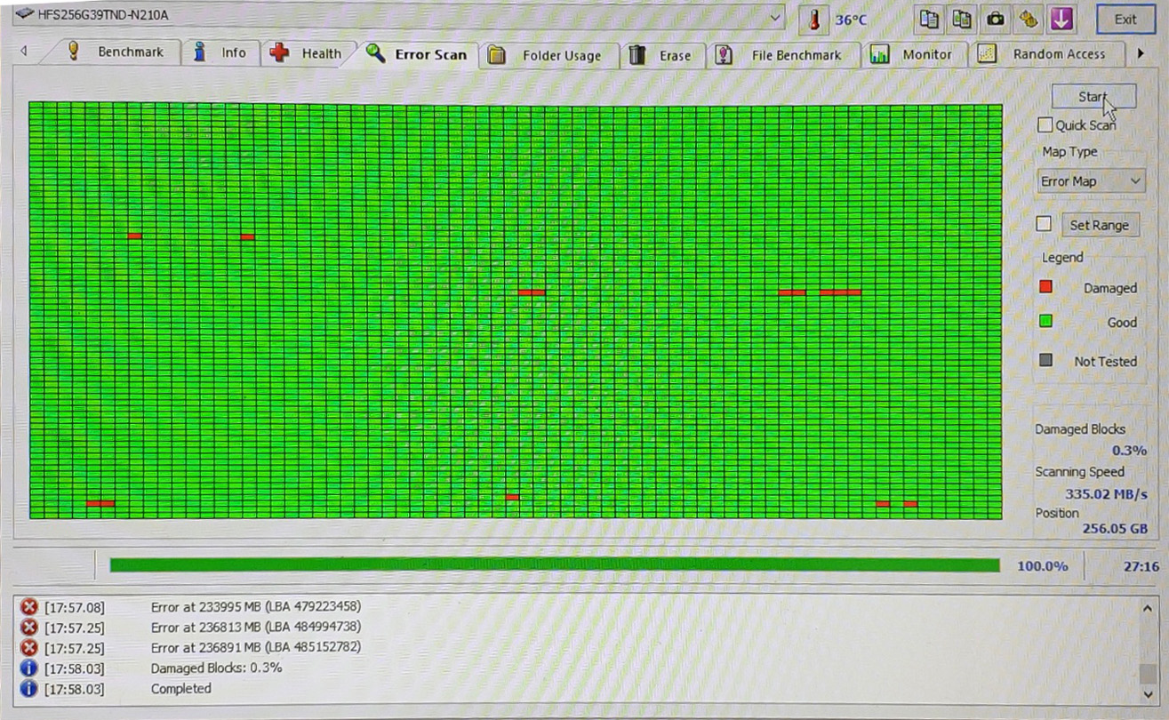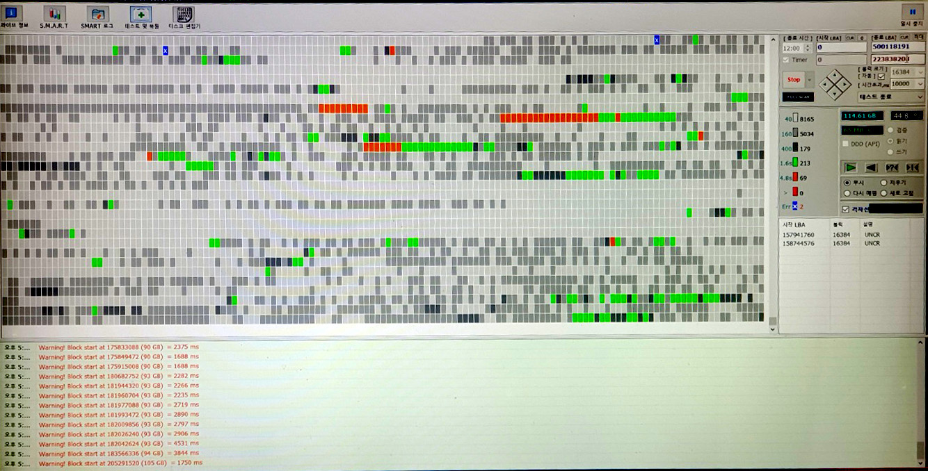 - Damaged Blocks: Error Scan에서 수많은 불량 섹터(빨간 블록) 발견.