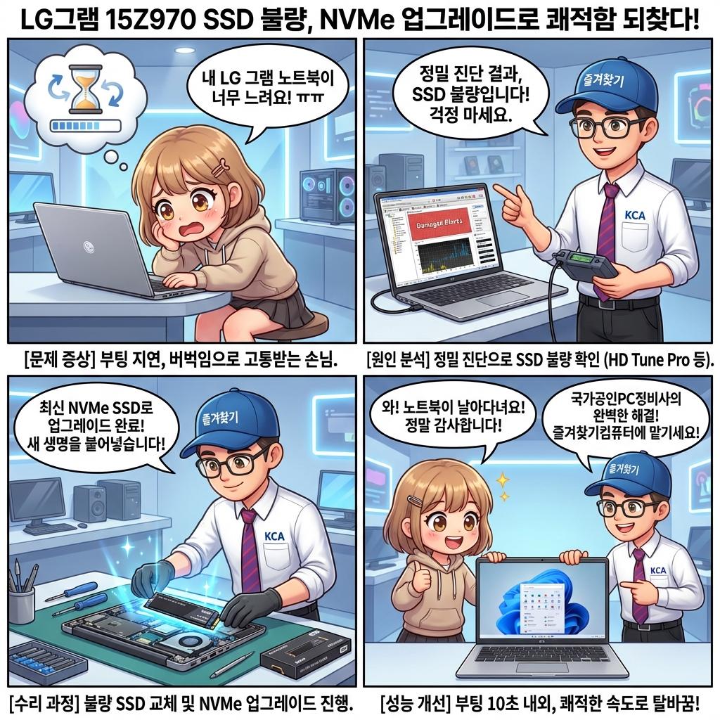 안녕하세요, 만촌동 즐겨찾기컴퓨터입니다. 수성구 만촌동에서 컴퓨터 판매, 조립, 수리, 그리고 알찬 교육까지 책임지는 즐겨찾기컴퓨터는 국가공인PC정비사1급 자격과 한국컴퓨터협회(KCA) 정회원으로서 고객님의 소중한 디지털 자산을 최상의 상태로 유지할 수 있도록 돕고 있습니다. 오늘은 LG gram 15Z970-TA5IK 노트북의 저장장치 불량으로 인해 발생한 고질적인 부팅 지연과 시스템 성능 저하 문제를, 최신 NVMe SSD 업그레이드로 깔끔하게 해결한 성공 사례를 소개해 드립니다. "내 노트북도 혹시?"라는 고민이 있으시다면, 지금 바로 만촌동 즐겨찾기컴퓨터, 053-752-5464로 연락 주세요!