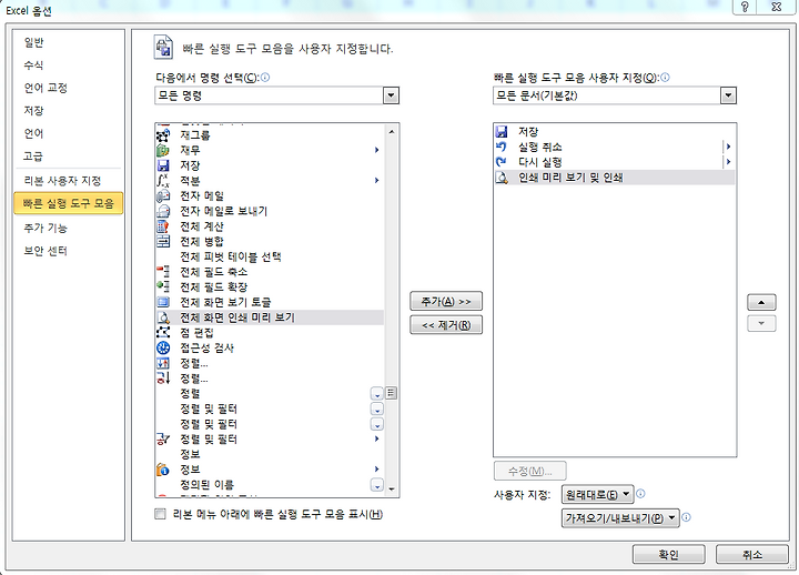 1. [파일]-[옵션]-[빠른 실행 도구 모음]